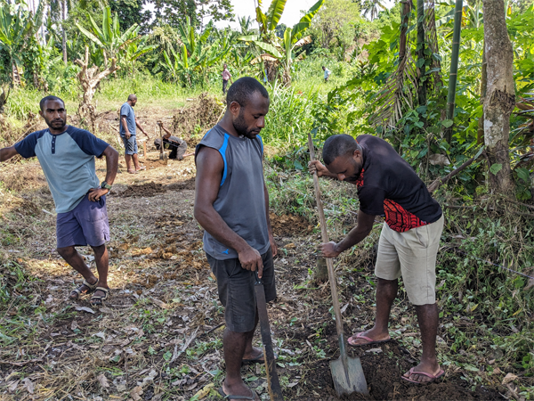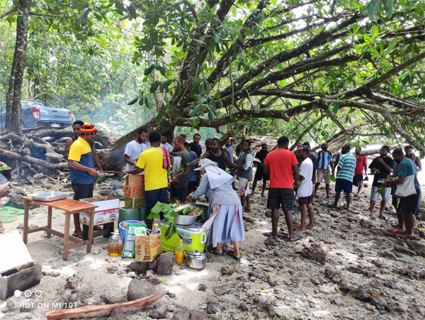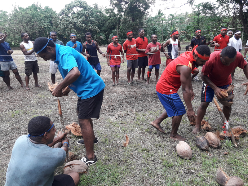 Seminarians are engaged in the process of de-shelling coconuts. It is important to note that the highlanders face significant challenges, as there are no coconut trees in that region.
